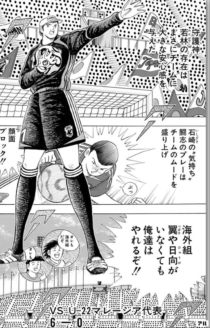 守護神 若林の存在は まさにチームに安心感を与えた 石崎の 気持ち 闘志のプレーは チームのムードを盛り上げ 顔面ブロック 海外組 翼や日向がいなくても 俺達はやれるぞ オレも海外組だぞ オレも キャプテン翼 Golden 23 アル